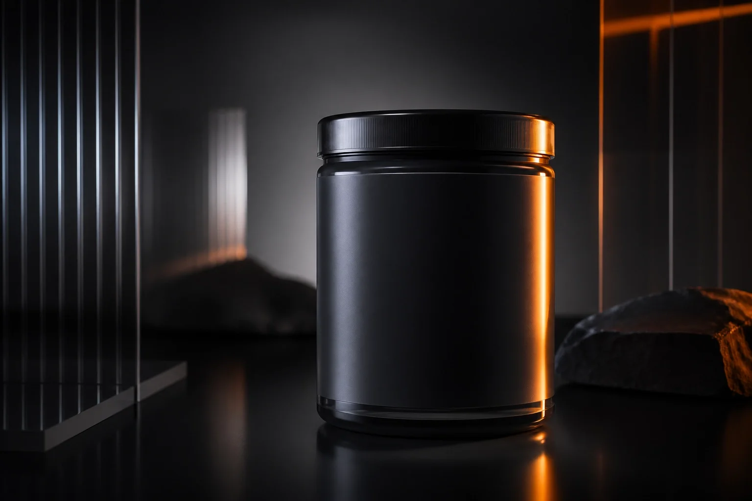 Minimalist and high-contrast visual of a hydration supplement container, representing the final, polished result of expert powder engineering.