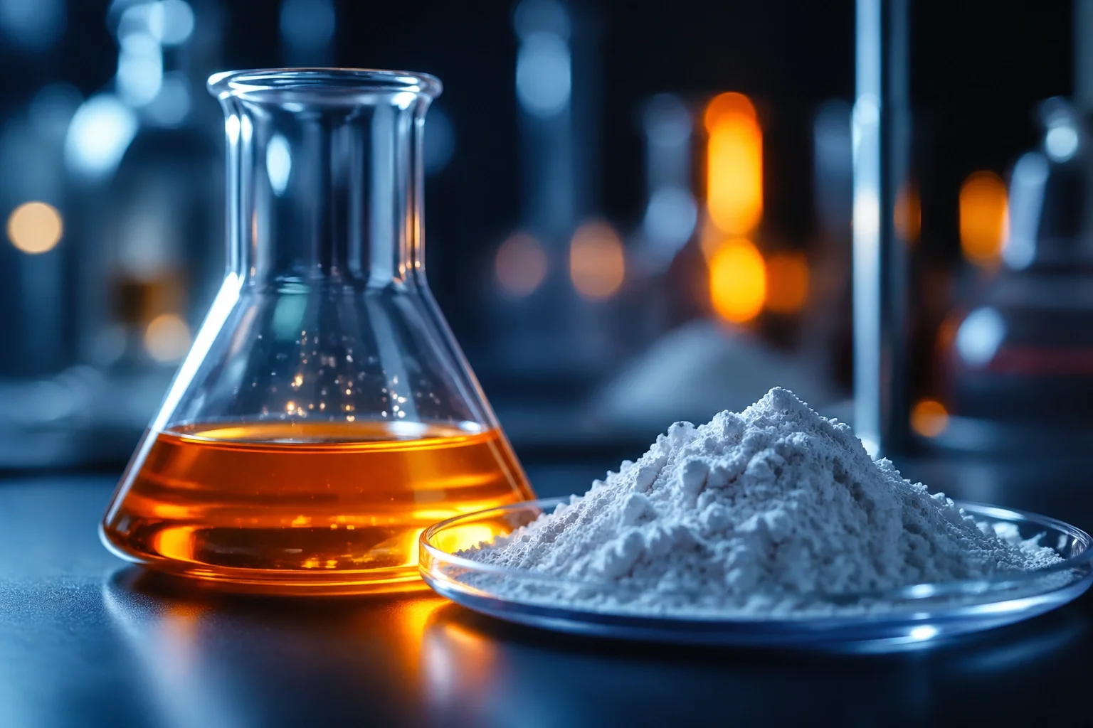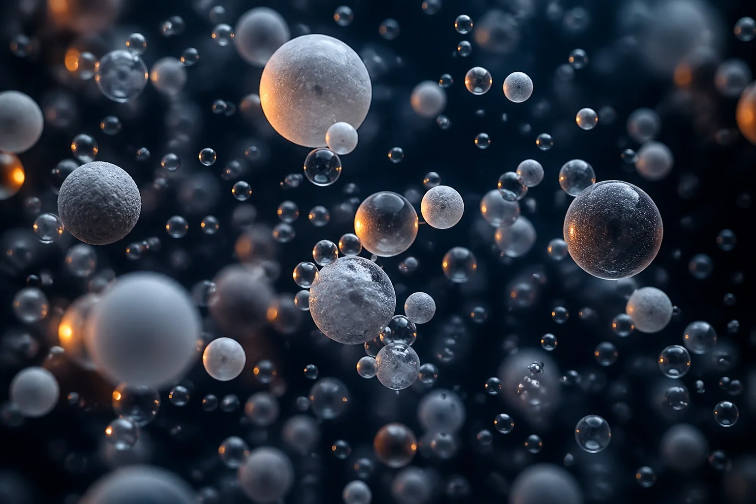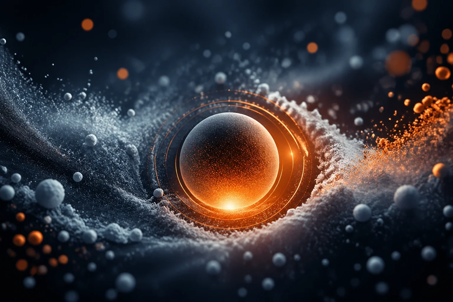 Abstract visualization of powder particles of varying sizes, representing the technical precision required for stable and flavorful formulations.
